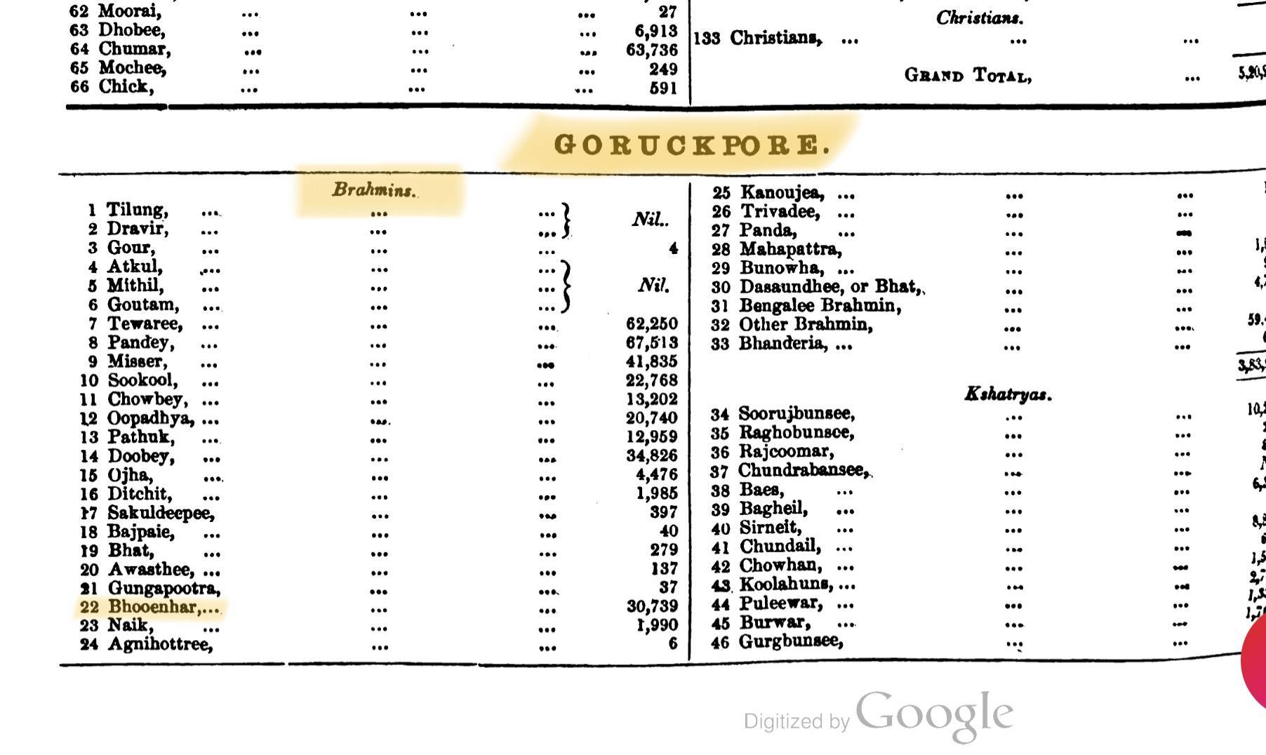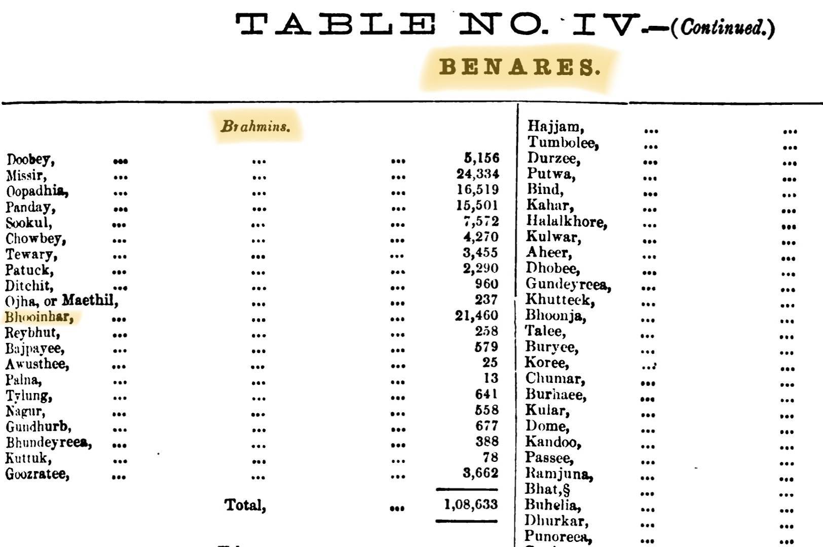 Remarks: Bhumihars were not classified as Shudras or even Vaishyas in the 1865 Census, they were either grouped with Kshatriyas or Brahmins.