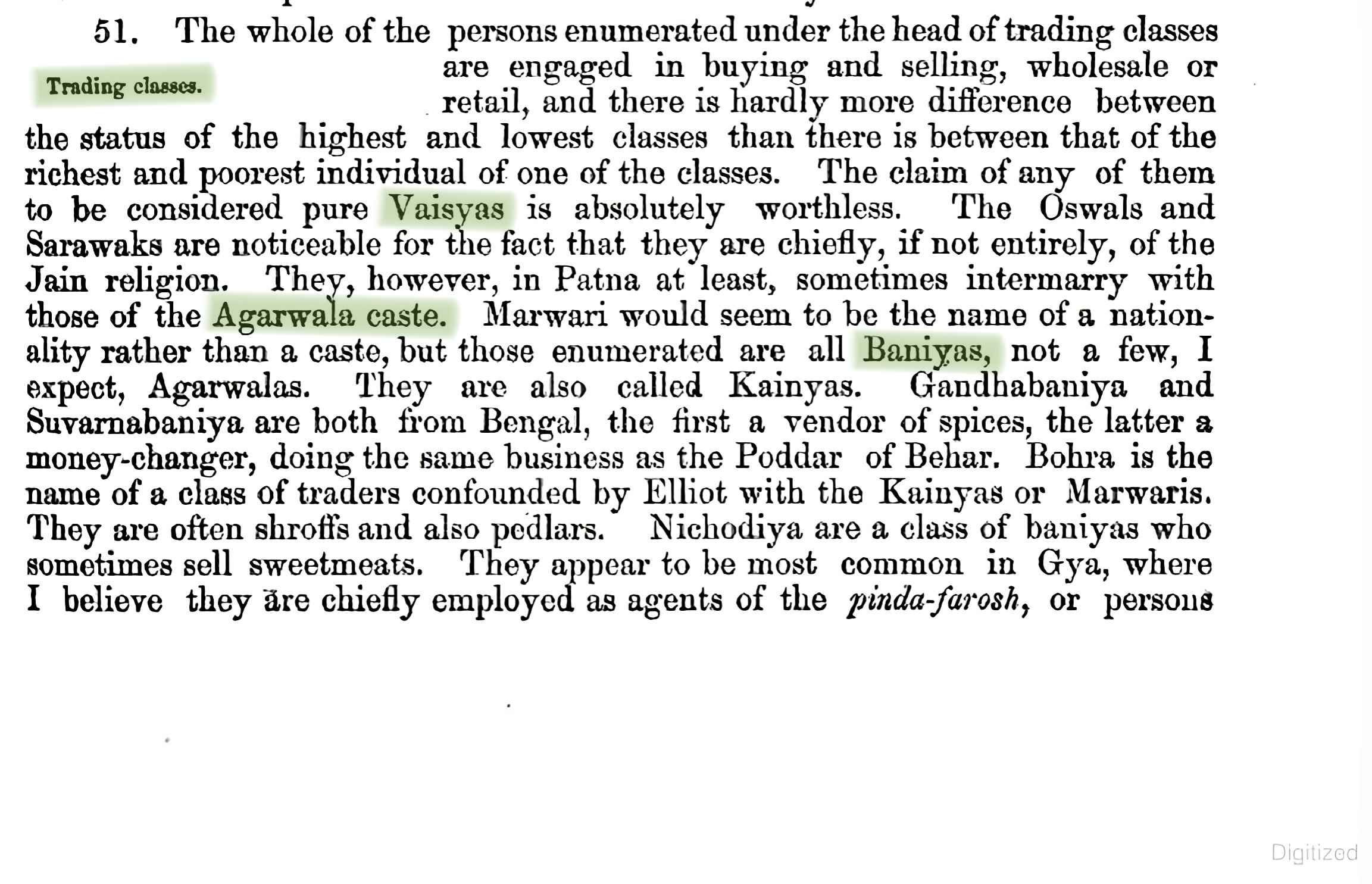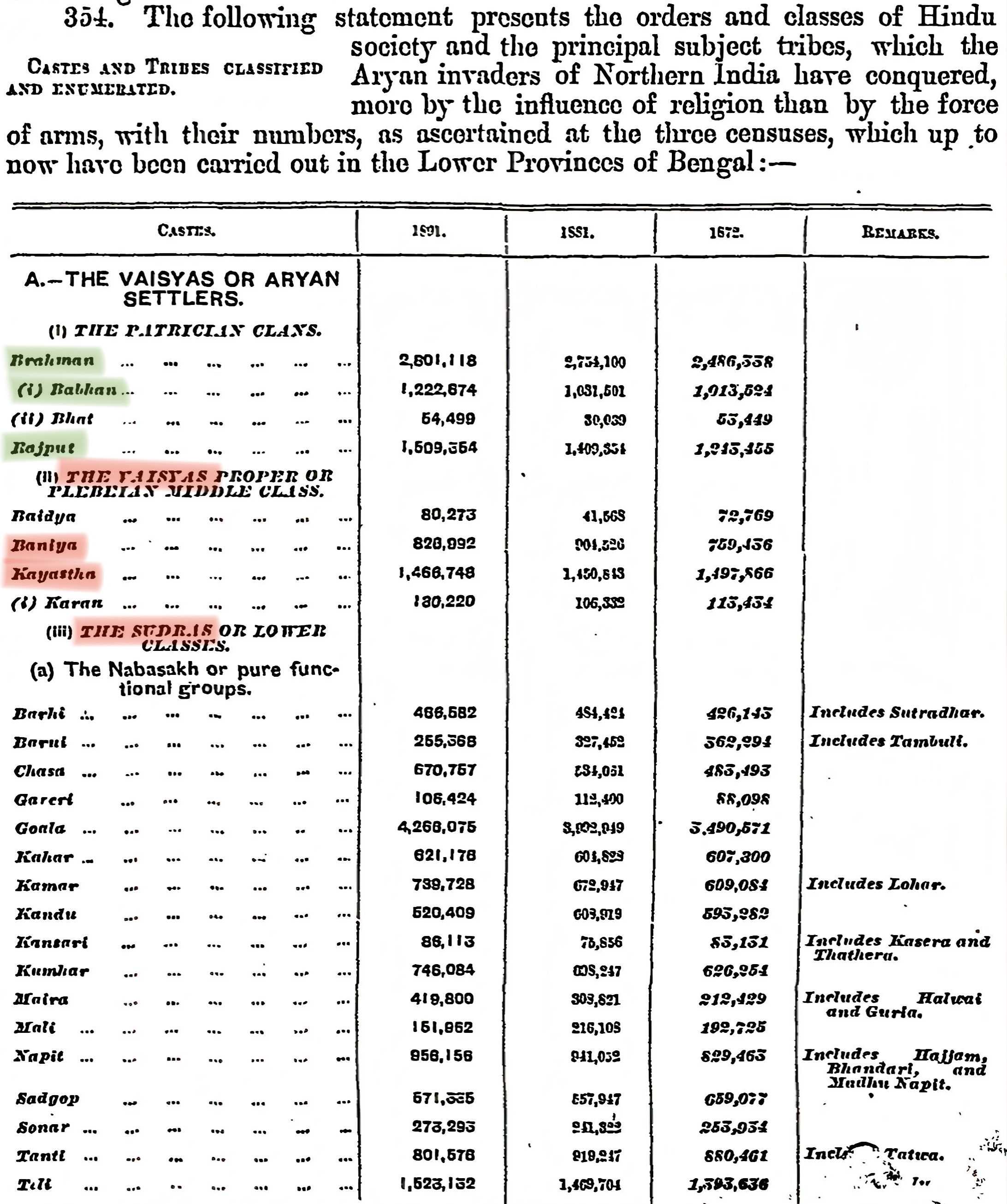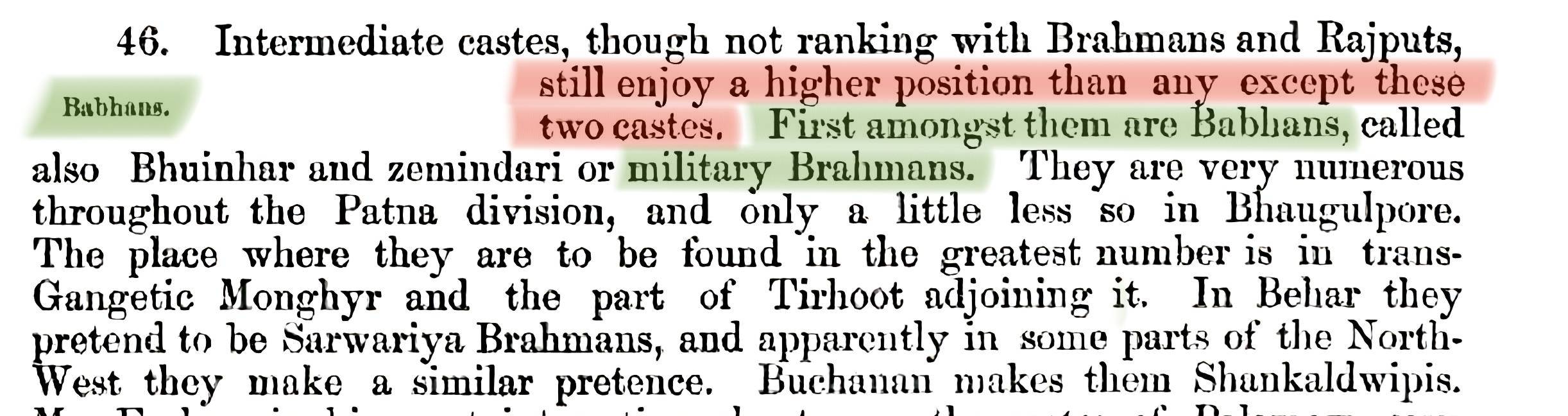Remarks: In the 1872 census, British did not place Bhumihars (Babhans) under the Vaishya or Shudra varna, nor did they assign them to any varna. However, since Bhumihars were listed after Brahmins and Rajputs, readers often assume that they were therefore classified as Vaishyas. This assumption is wrong because Vaishyas are described totally separate from Bhumihars on point-51 (Trading Classes) page 171–172, after Baidyas & Kayasthas. In contrast, Bhumihars were discussed separately at point 46, placed before, and totally distinct from Kayasthas, Vaishyas, and Shudras & Baidyas. They were described as first among the intermediate castes, explicitly described as ‘Military Brahmans’ and were stated to "enjoy a higher position than any other caste except Brahmans and Rajputs".