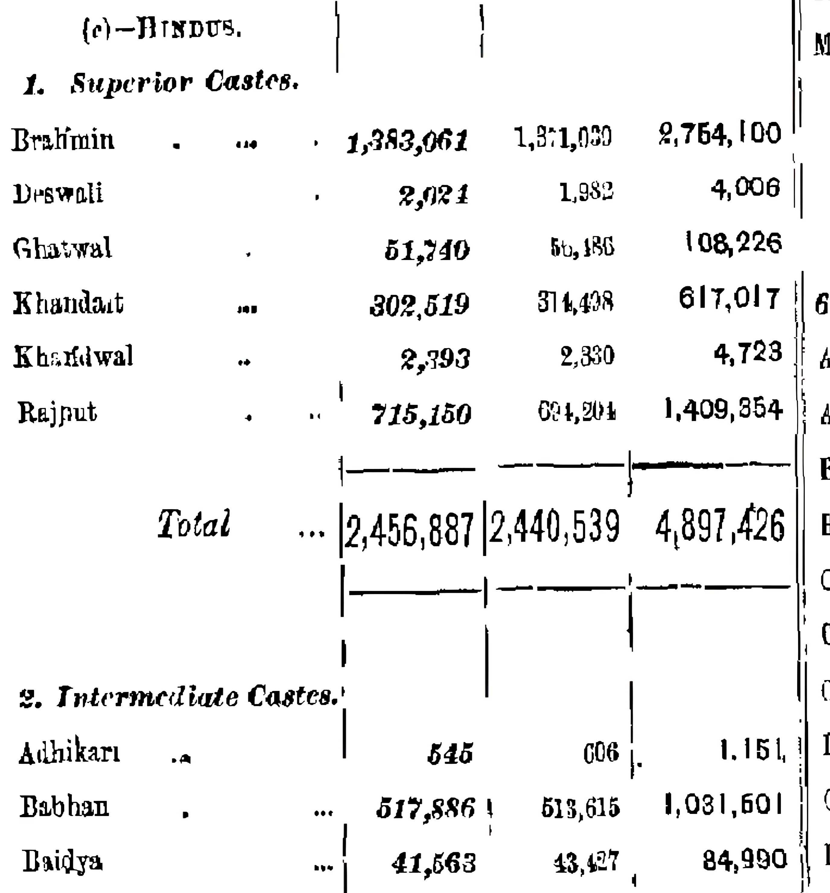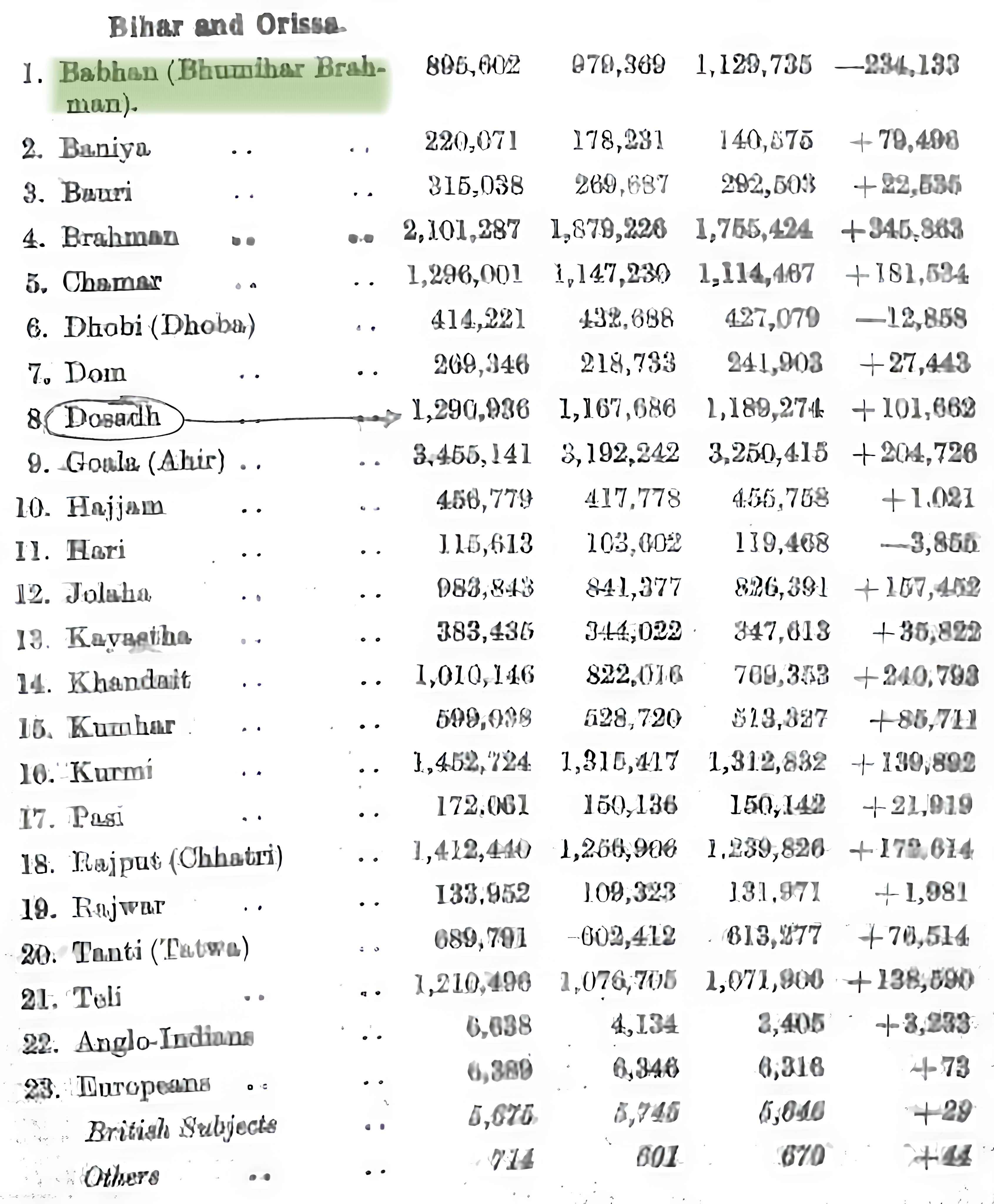 नोट: किसी भी जनगणना की हर table में क्रम संख्या सामाजिक रैंकिंग को दर्शाने के लिए नहीं होती। लेकिन 1901 की तालिका का title स्पष्ट रूप से ‘by social precedence’ है, जिसका अर्थ है कि इस तालिका में दिया गया क्रम सामाजिक वरीयता, अर्थात सामाजिक रैंकिंग, को दर्शाता है।