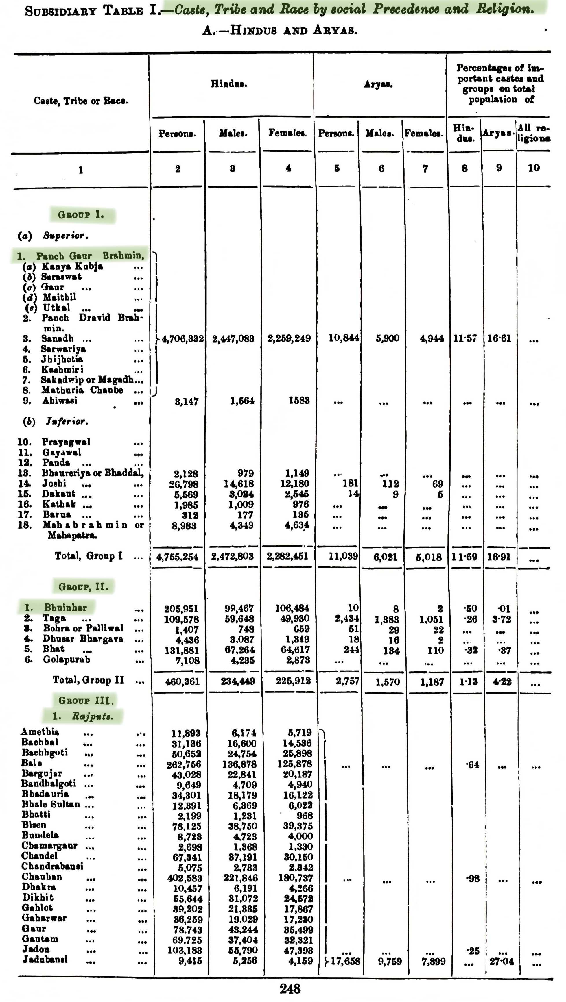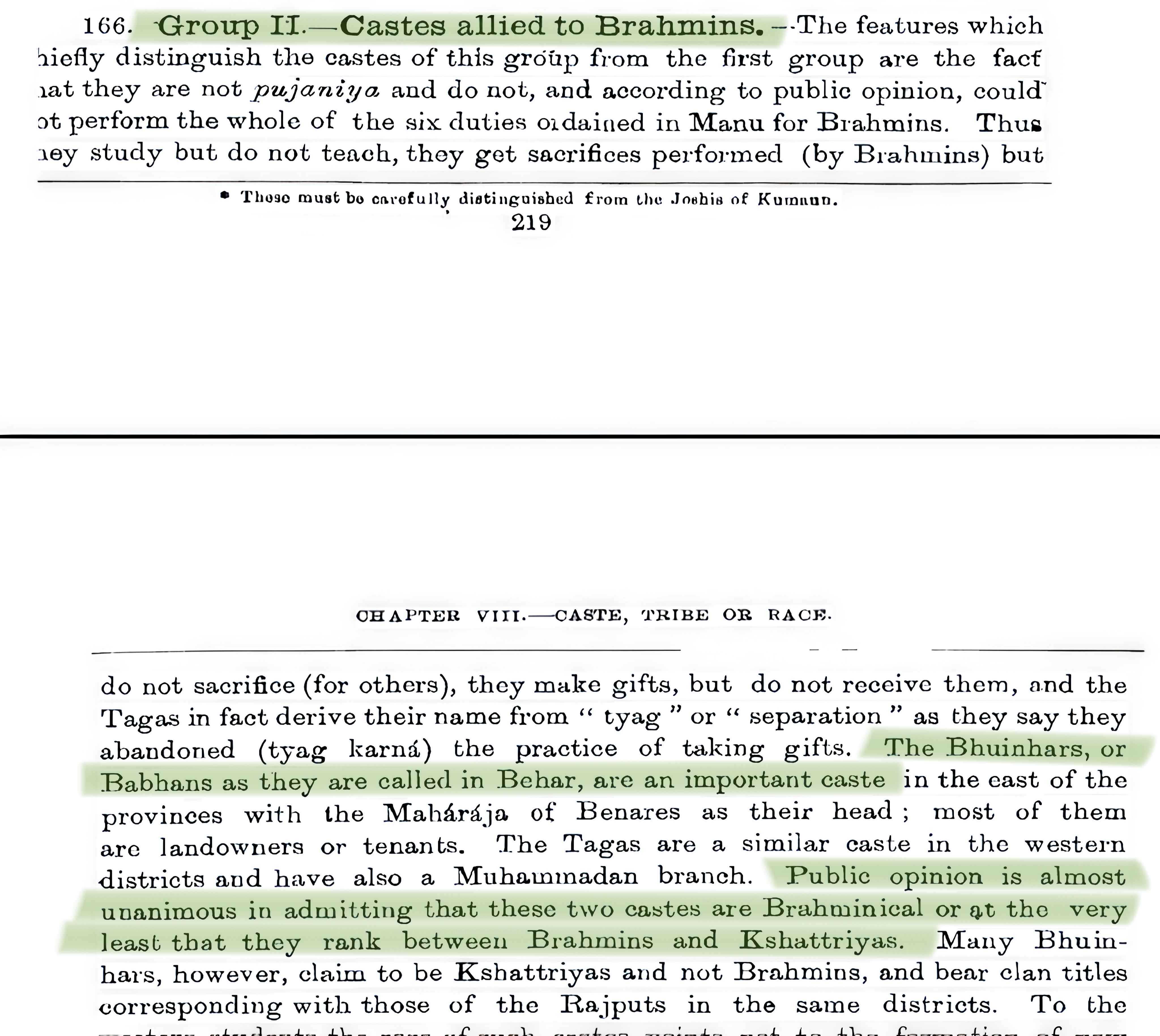 Remarks: In the census of 1901, Bhumihars were placed above Rajputs, Kayasthas and Vaishyas. Clearly, not classified as Vaishya, Shudra. The serial order denotes the social ranking as evident from the title of the Table - "Caste, Tribe and Race by Social Precedence". Bhumihars were classed as a caste that was allied to Brahmins, and thus placed in Group II. In the Census it was also mentioned that the general public viewed Bhumihars as superior to the Rajputs.