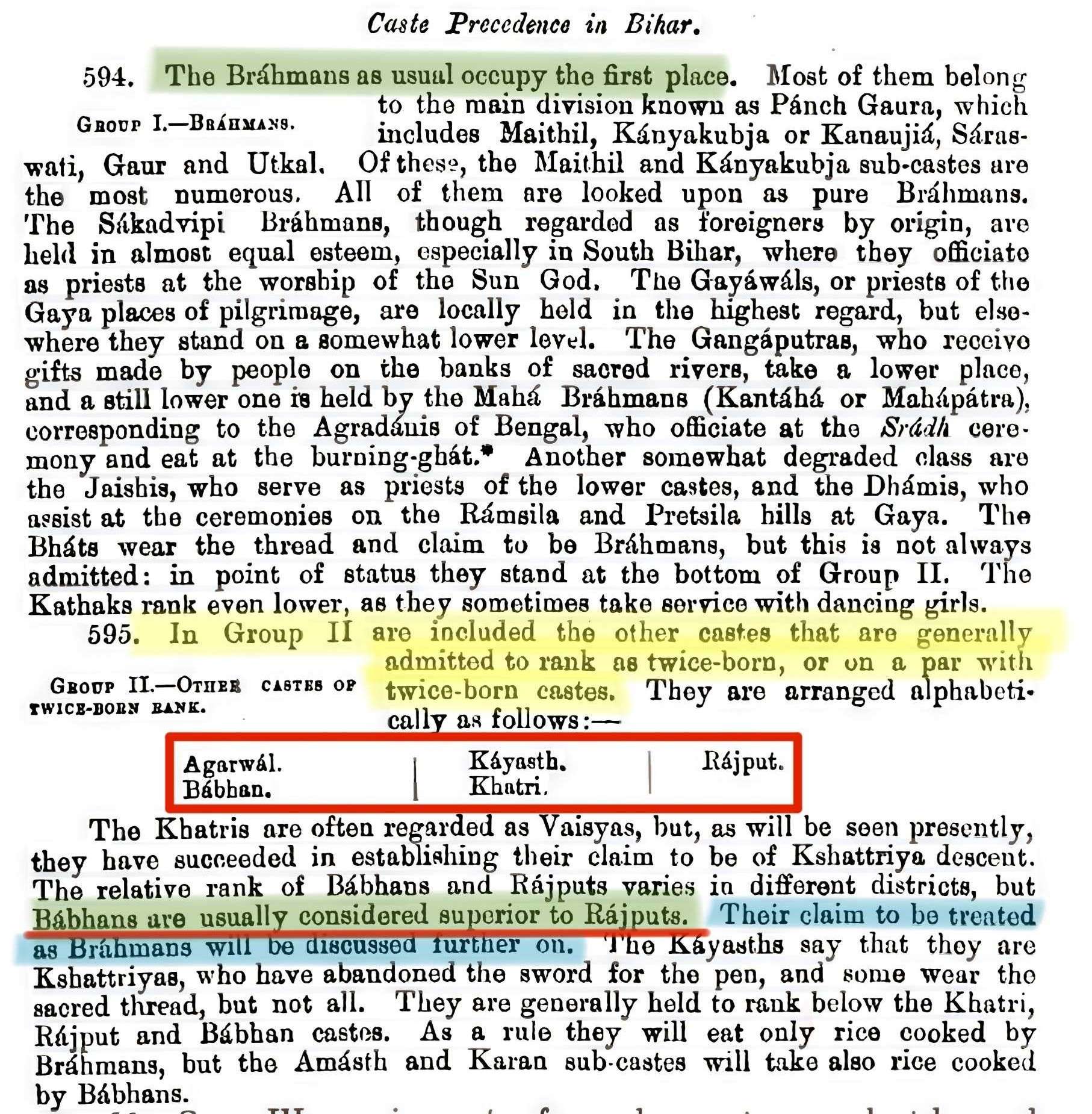 Categorisation of Bhumihars: In the social precedence Ranking, Bhumihars were placed in Group II (Defined as the class ALLIED to Brahmins) classified as above Rajputs & Kayasthas, but below Brahmins, who were in group I.